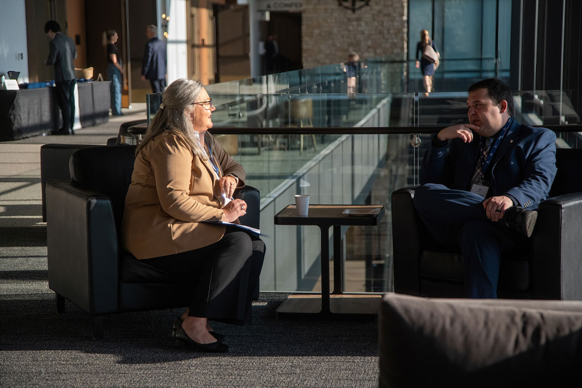 Vicki Schwab from MEDC speaking with an attendee at the 2023 InvestUP CEO Summit in Marquette, Michigan.