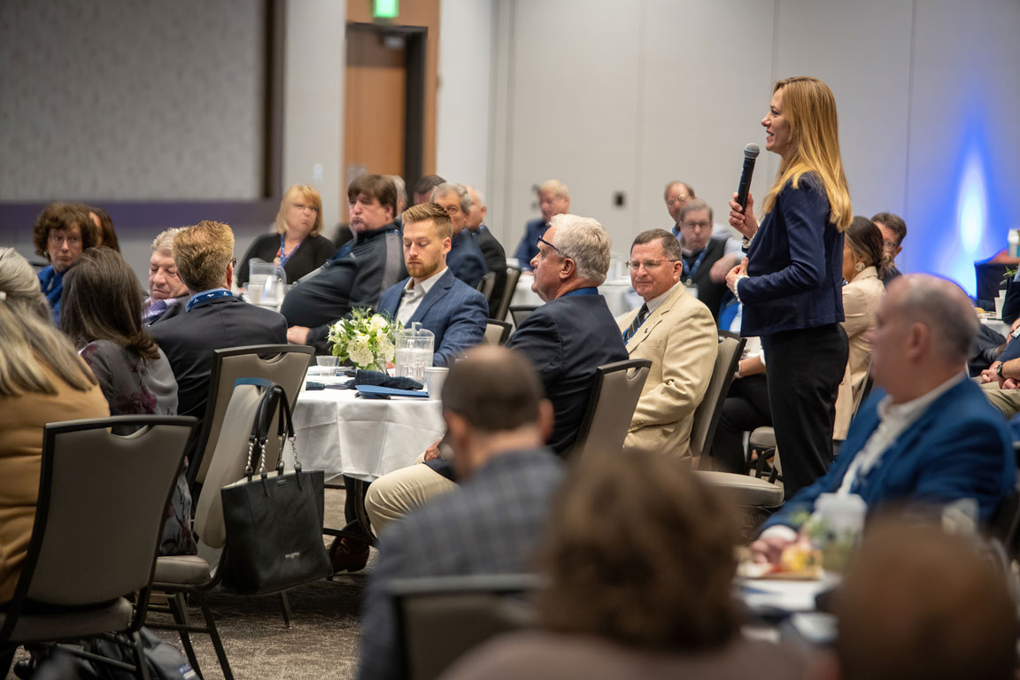 Gina Thorsen asking a question within the audience at the 2023 InvestUP CEO Summit in Marquette, Michigan.