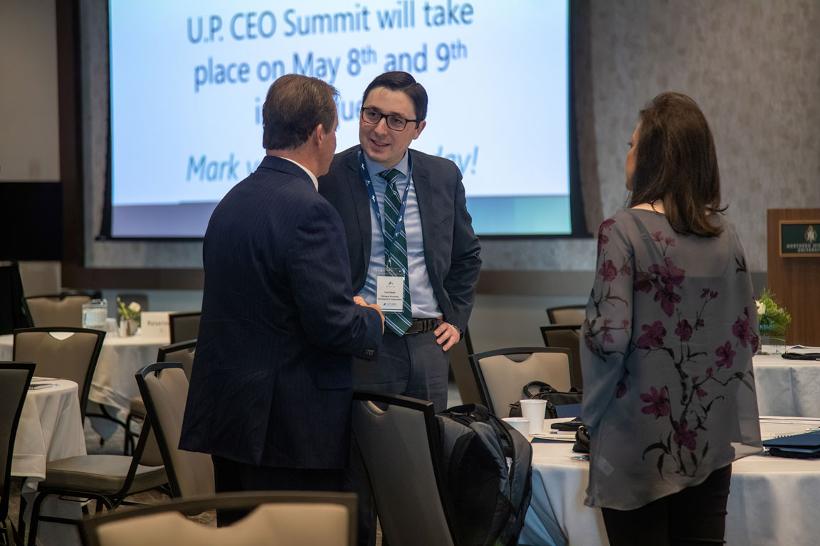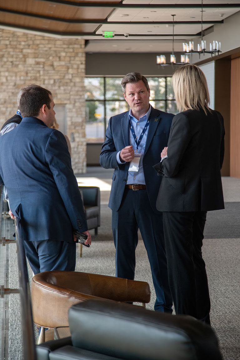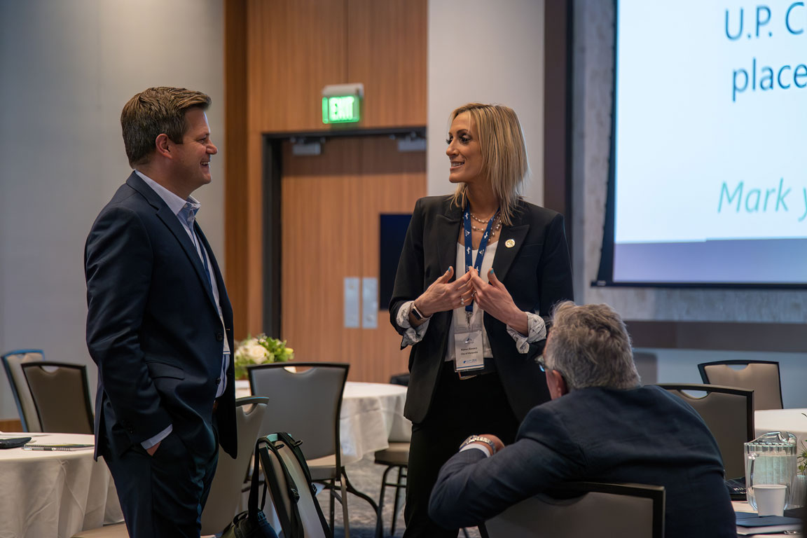 Leo Isleib from MEDC speaking with an attendees at the 2023 InvestUP CEO Summit in Marquette, Michigan.