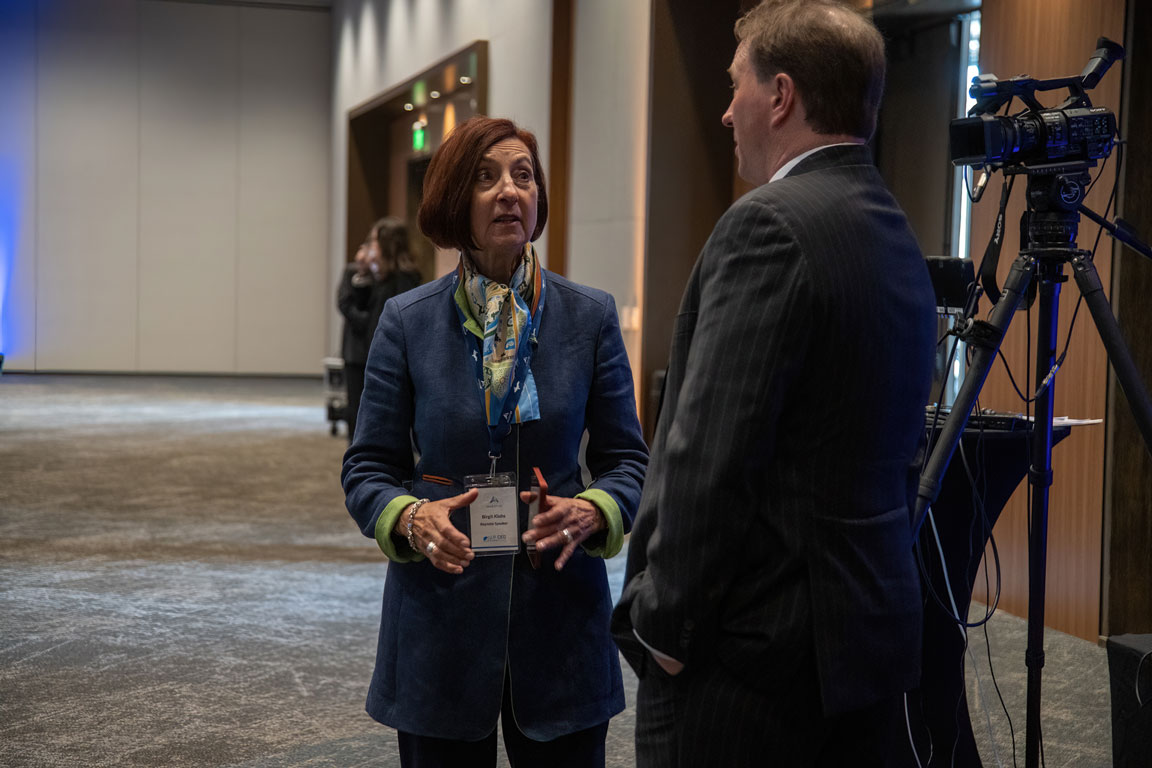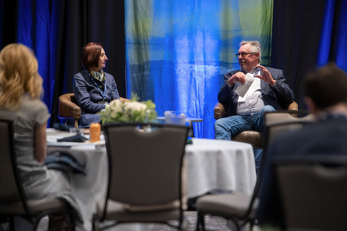 Birgit Klohs, Keynote Speaker at the 2023 InvestUP CEO Summit in Marquette, Michigan, speaking with Vince Nystrom of InvestUP.