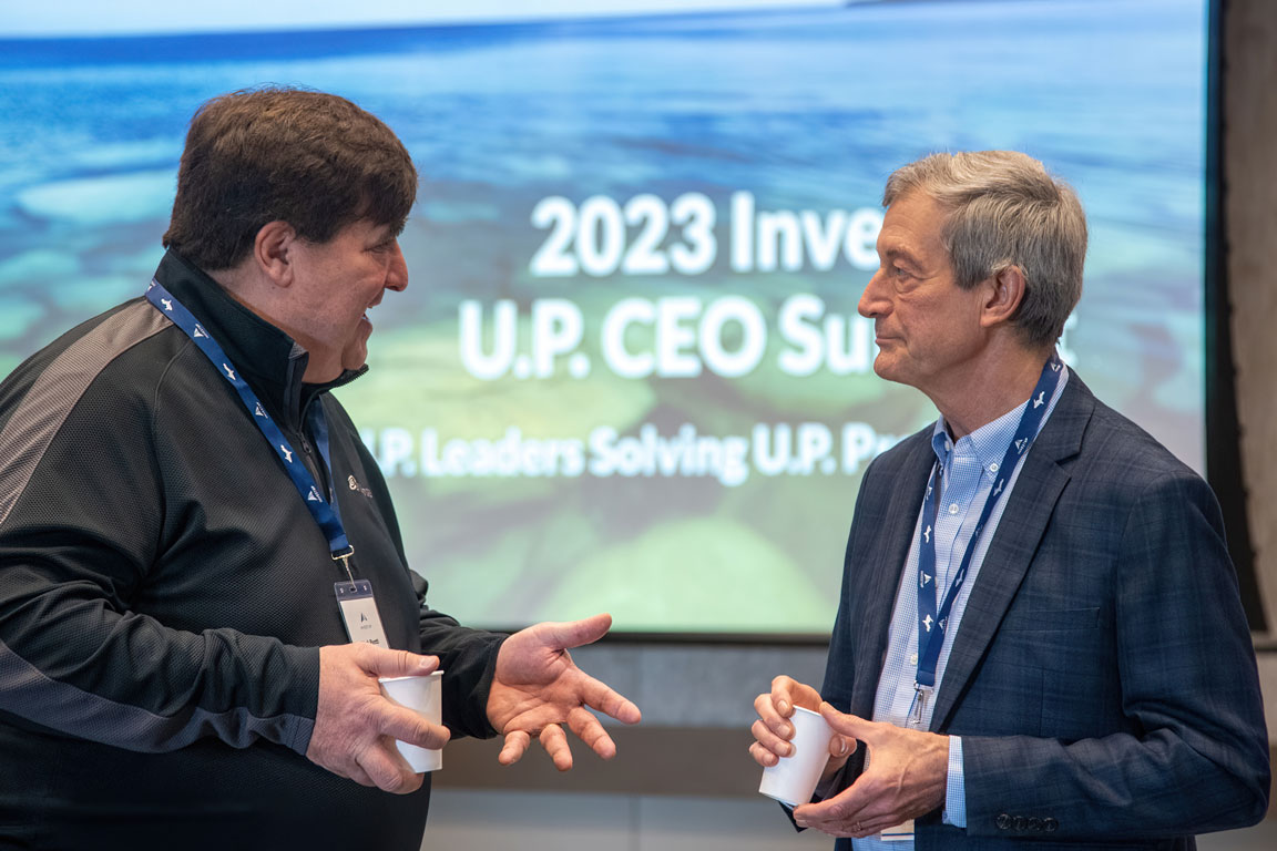 Mark Pontti of Enbridge, and Terrence Dehring of QuickTrophy at the 2023 InvestUP CEO Summit in Marquette, Michigan.