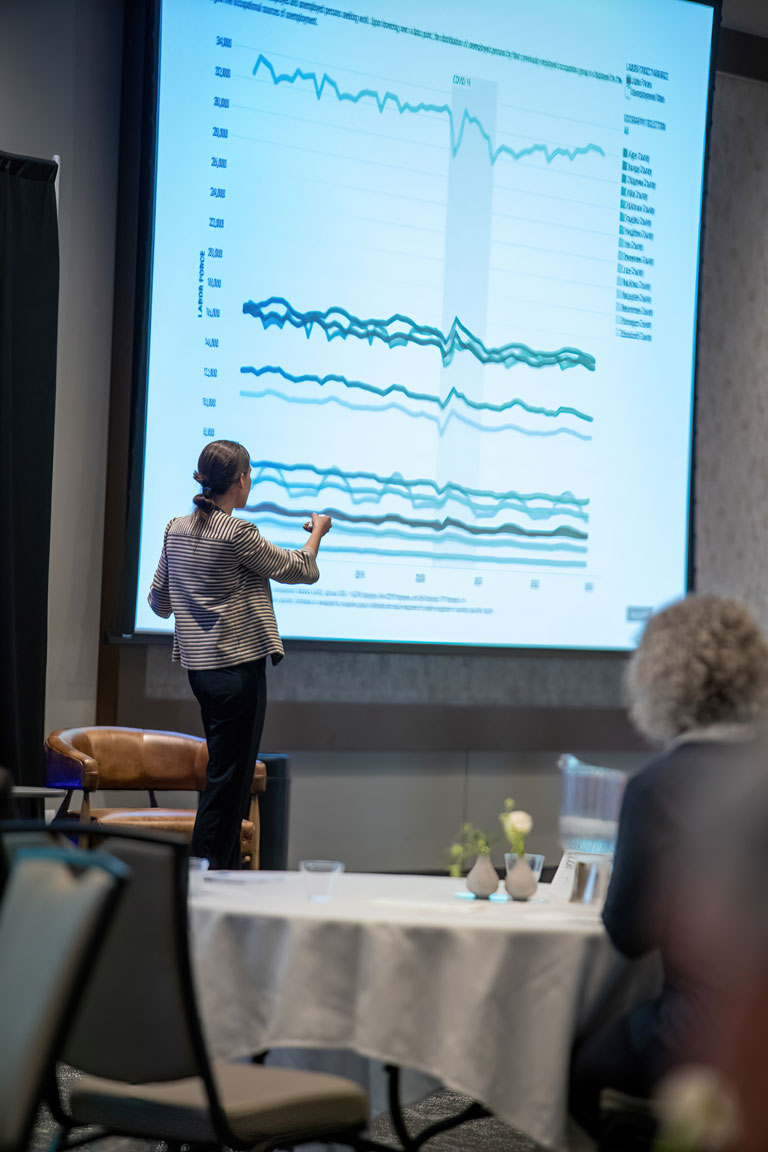 Featured speaker Neel Kashkari, president and CEO of the Federal Reserve Bank of Minneapolis, directly engaged the audience, gathering real-time responses about issues of interest to the region. Key findings were that the majority of businesses represented in the room are hiring, and that leaders’ biggest current concern is the lack of available local housing. View Mr. Kashkari’s presentation here.