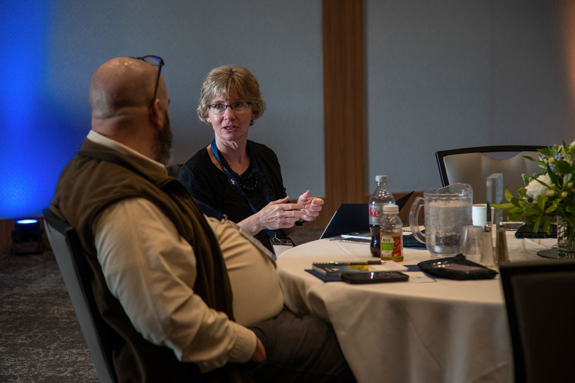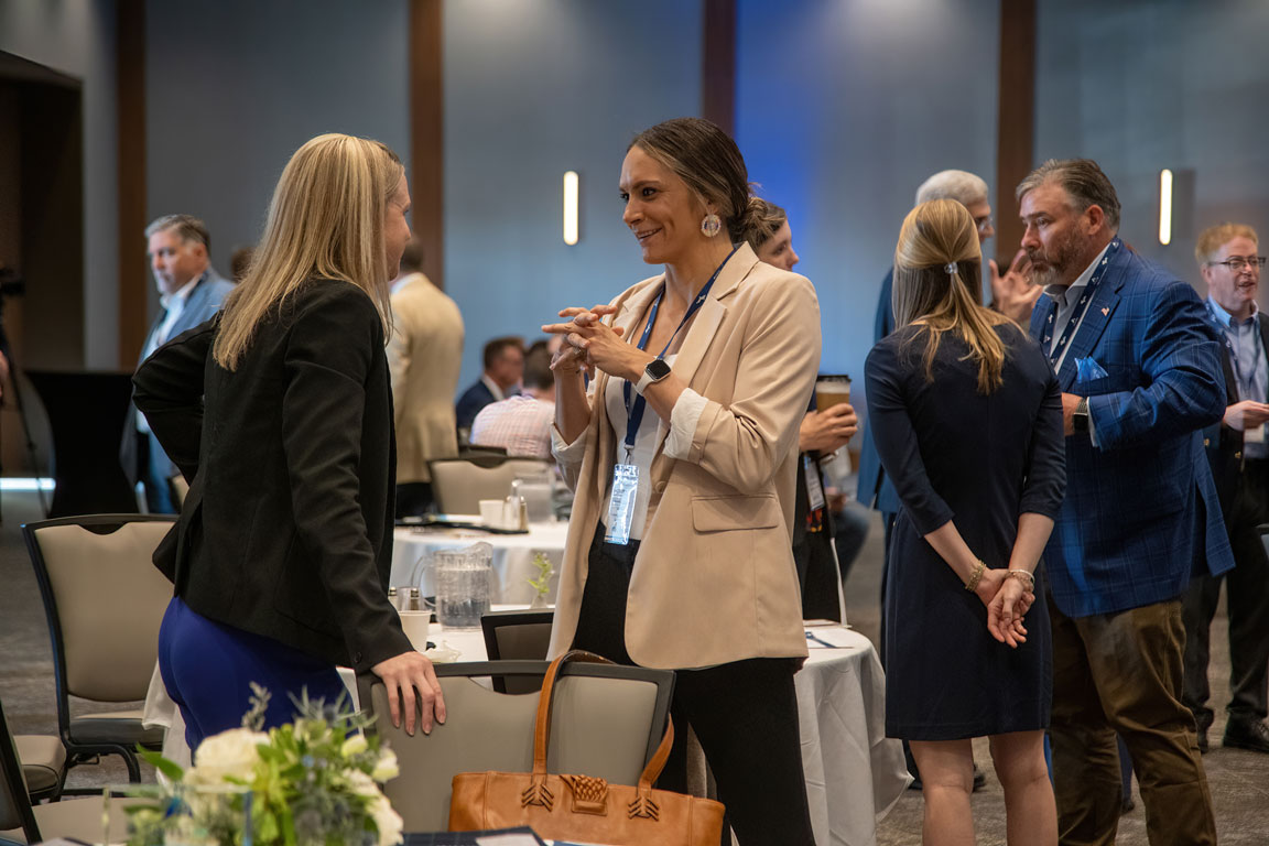 Bobbi Wood from ThermoAnalytics speaking with an attendee at the 2023 InvestUP CEO Summit in Marquette, Michigan.